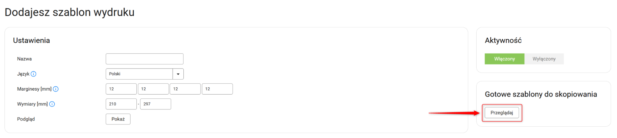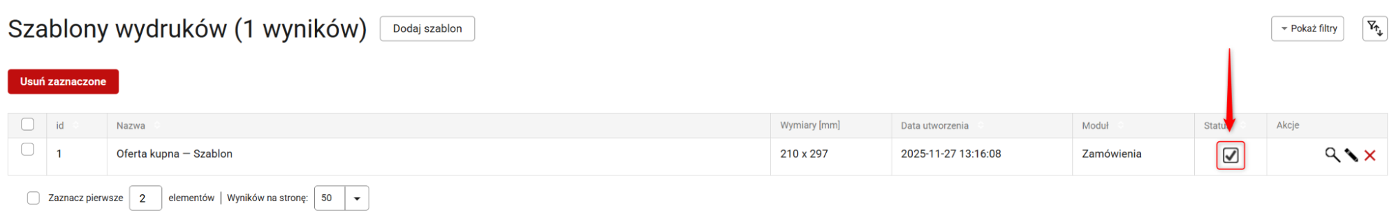 7. W każdej chwili możesz wyłączyć szablon. Wystarczy, że przejdziesz do Administracja → Szablony wydruków i w kolumnie Status odznaczysz dany checkbox.
