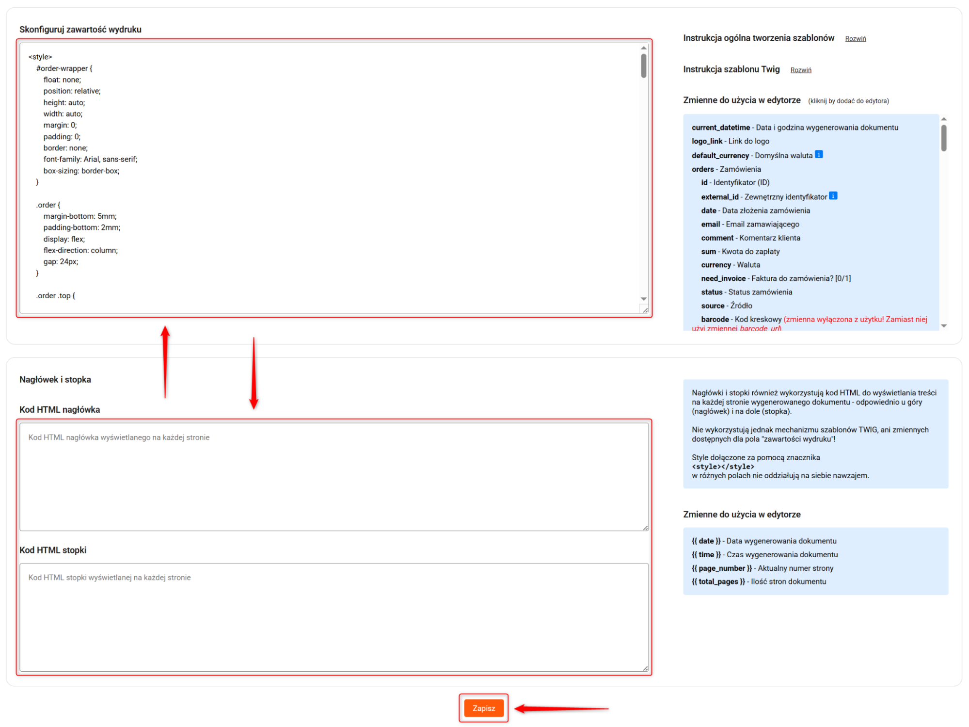 5. W oknie Skonfiguruj zawartość wydruku zmodyfikujesz kod szablonu, a w oknie Nagłówki i stopki ustawisz elementy widoczne na każdej stronie dokumentu. Po skończeniu edycji zapisz zmiany.