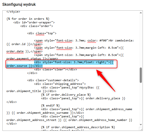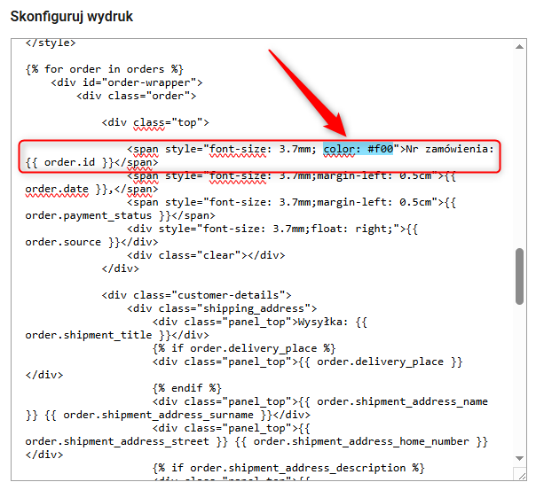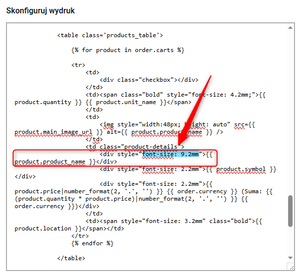 Jeśli tytuły zamówień są za małe i słabo widoczne na wydruku, możesz łatwo je powiększyć, edytując właściwość font-size i zmieniając wartość po dwukropku, np. na 9.2mm.