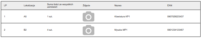 Zgrupuj i posortuj wszystkie produkty z wielu zamówień w jednej zbiorczej tabeli, znacznie skracając proces zbierania. Jeśli w kilku zamówieniach pojawi się produkt z tym samym kodem EAN, ich liczba zostanie zsumowana i umieszczona jako jedna pozycja w tabeli (w przypadku, gdy dany produkt nie posiada kodu EAN, jest on grupowany według nazwy produktu). Następnie wszystkie produkty zostaną posortowane według lokalizacji (możesz dowolnie modyfikować klucz grupowania i sortowania — więcej o tym w sekcji "Edycja szablonów wydruków”).