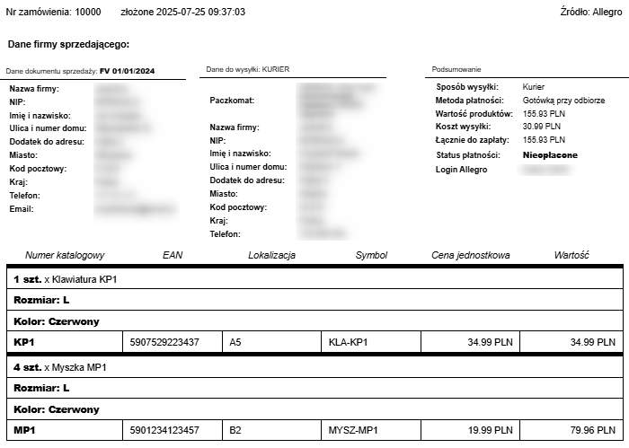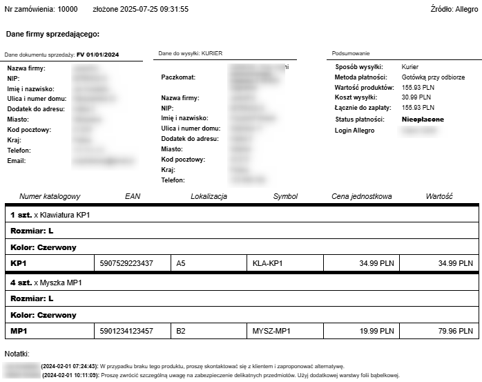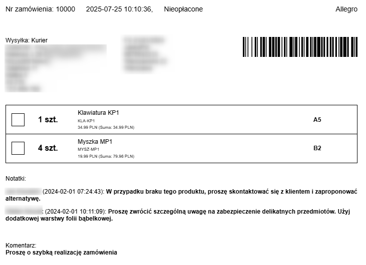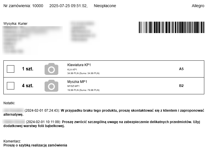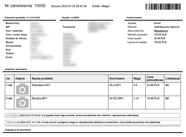 Wydrukuj kompletny podgląd zamówienia — od pełnych danych klienta i informacji o dokumencie sprzedaży, przez sposób wysyłki i listę produktów, aż po wewnętrzne notatki dotyczące realizacji.