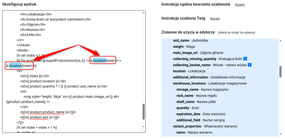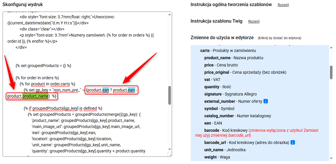 Jeśli potrzebujesz zmodyfikować typ albo sposób wyświetlania danych na wydruku, zrobisz to poprzez edycję zmiennych w kodzie. Na poniższym zrzucie ekranu, na przykładzie szablonu "Zbieranie – grupowanie: EAN – sortowanie: Lokalizacja”, zobaczysz prostą modyfikację zmiennych, według których grupowane i sortowane będą produkty dla zamówień.