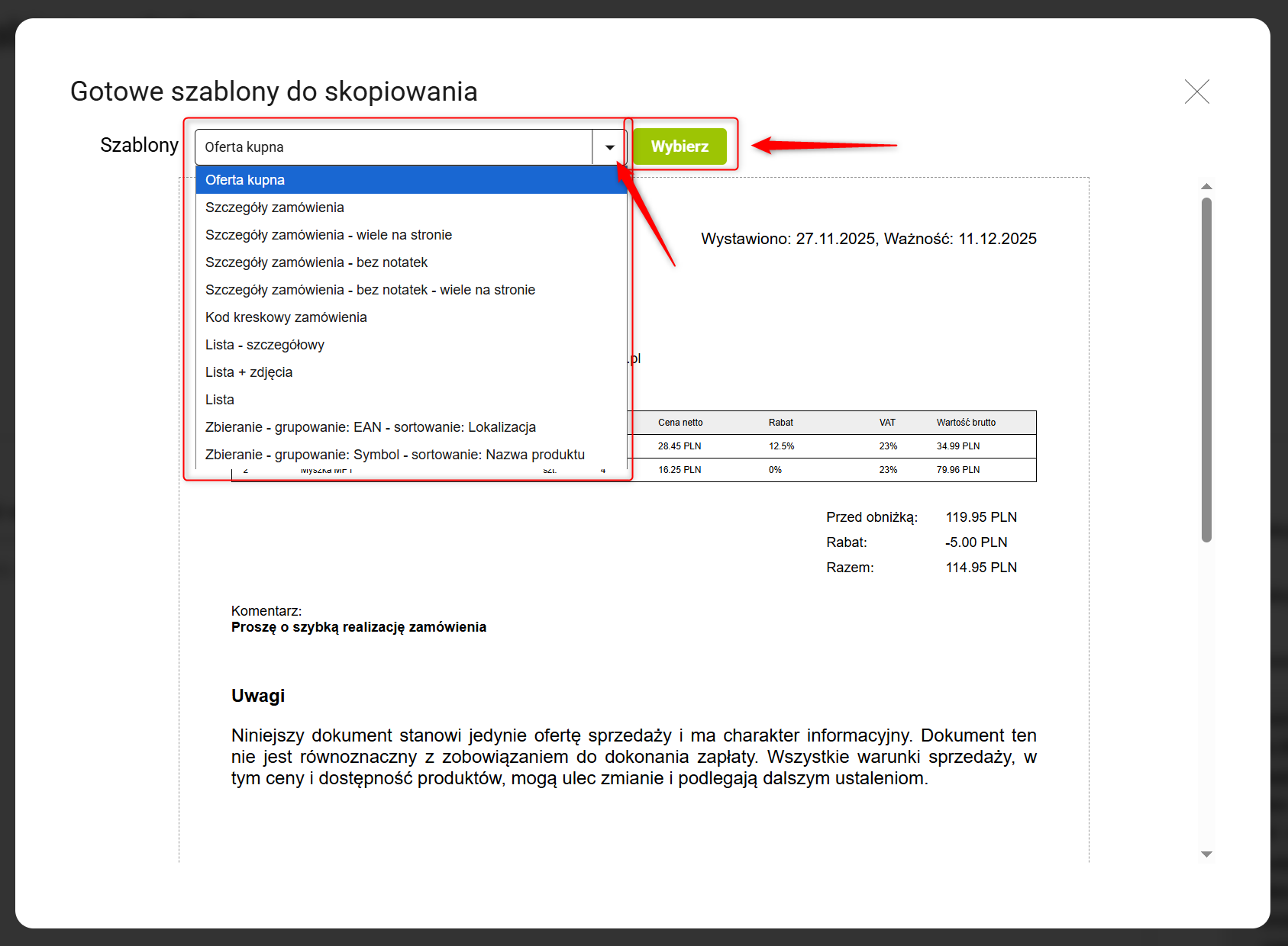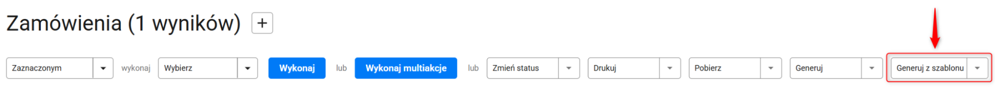 6. Twój nowy szablon będzie dostępny w zakładce Zamówienia → Zamówienia → Generuj z szablonu. Aby pobrać PDF, wystarczy, że wybierzesz zamówienie i użyjesz stworzonego szablonu.