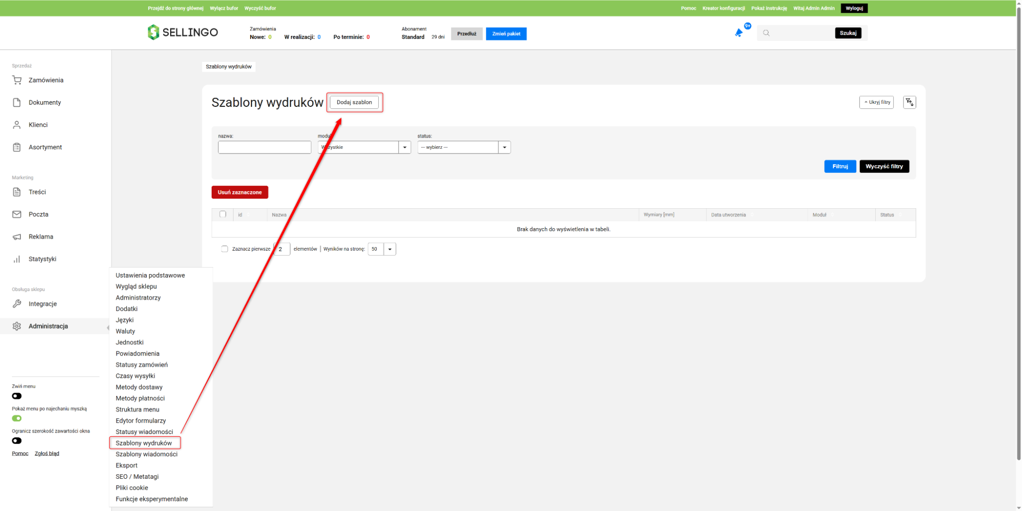 1. W menu głównym panelu przejdź do Administracja → Szablony wydruków i kliknij przycisk Dodaj szablon.