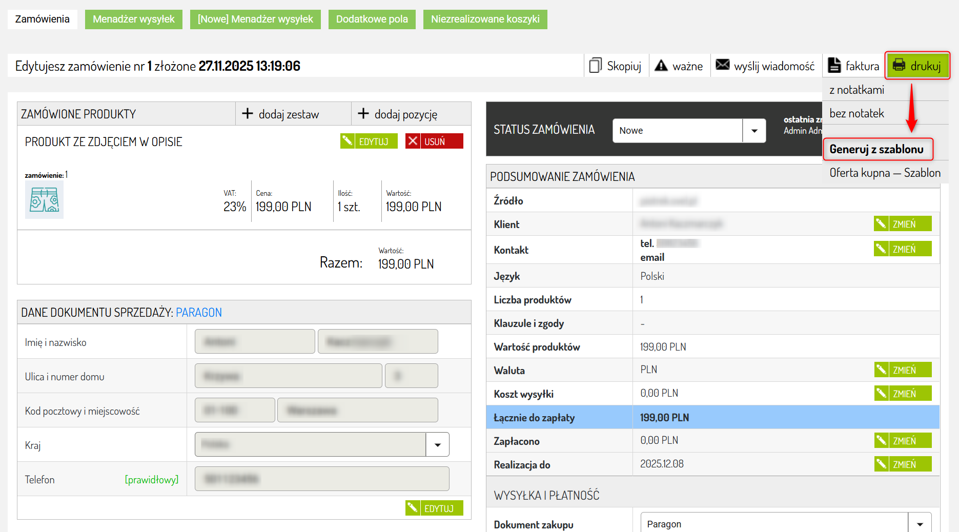 Aby wygenerować dokument na podstawie szablonu bezpośrednio w edycji zamówienia, wybierz Drukuj → Generuj z szablonu.