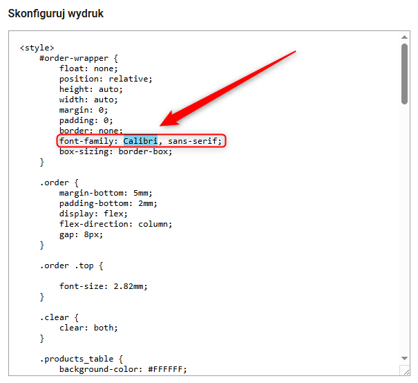 Jeśli chcesz, możesz także zmienić czcionkę dla całego wydruku. Aby to zrobić, w górnej części kodu znajdź linię z właściwością font-family i zmień nazwę fontu, np. z Arial na Calibri.