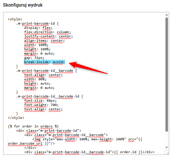 Dla kodu kreskowego zamówienia z ID wstaw właściwość break-inside: avoid; wewnątrz klamry .m-print-barcode-id.