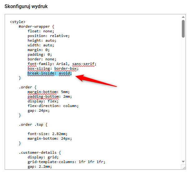 Jeśli z pomocą szablonu drukujesz wiele zamówień na raz, dodaj właściwość break-inside: avoid;. Dzięki temu elementy wydruku nie będą obcinane w połowie, tylko w całości przenoszone na następną stronę.