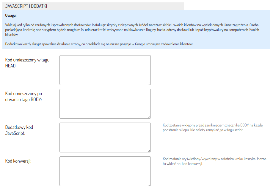 - Sekcja JavaScript i dodatki: W tym miejscu możesz wprowadzić indywidualne skrypty, które będą uruchamiane na stronie Twojego sklepu.