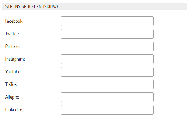 - Sekcja Strony społecznościowe: W tym miejscu możesz uzupełnić linki do swoich mediów społecznościowych.
