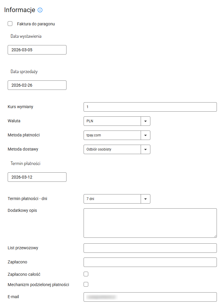 4. W sekcji Informacje uzupełnij dane dotyczące dokumentu (np. data, numer serii, sposób płatności).