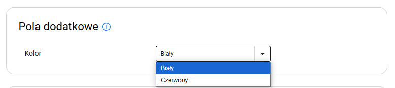 Typ pola: Wybierz typ Text (pole tekstowe) lub Select (lista opcji do wyboru) Wskazówka: Typ Select pozwala przygotować listę wartości, np. Kolor: czerwony, niebieski, zielony