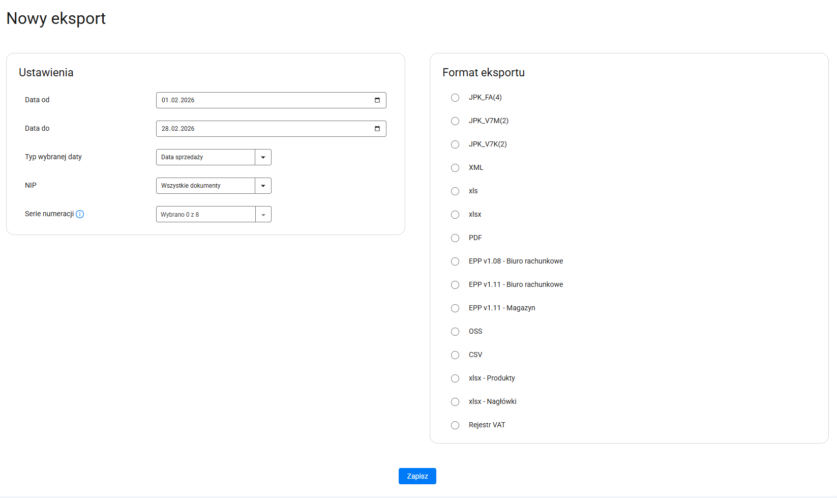 Po wypełnieniu formularza eksportu kliknij przycisk Zapisz, aby wygenerować eksport.