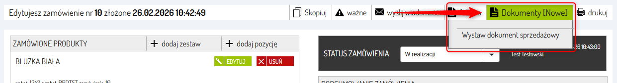 Po skonfigurowaniu serii, możesz rozpocząć wystawianie dokumentów sprzedaży. Można to zrobić na dwa sposoby — bezpośrednio z poziomu zamówienia lub z zakładki Dokumenty sprzedaży.