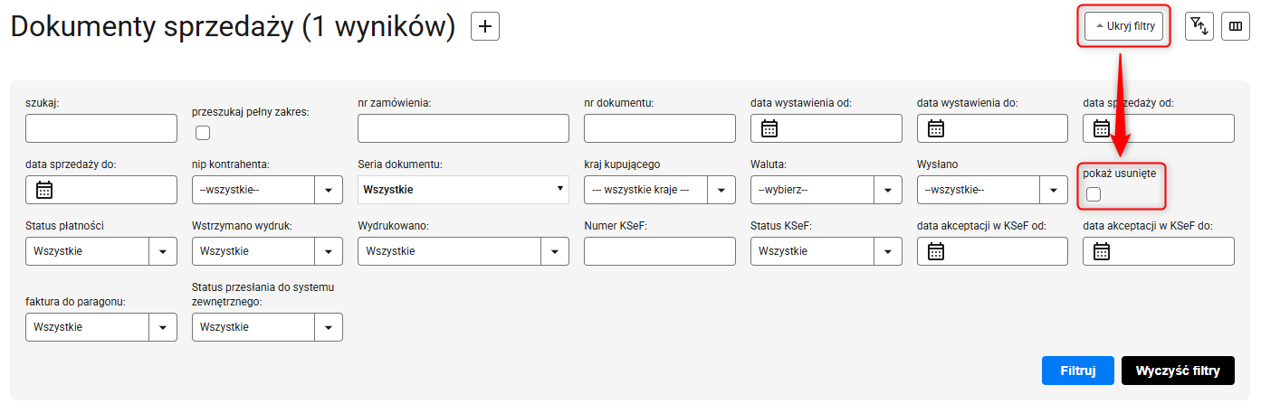 Wskazówka: Usunięte dokumenty nie są trwale usuwane, a zamiast tego trafiają do archiwum. Aby je wyświetlić, kliknij przycisk Pokaż filtr i zaznacz opcję Pokaż usunięte.