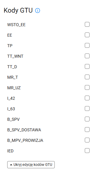 5. W sekcji Kody GTU możesz przypisać odpowiednie kody, zaznaczając właściwe checkboxy. Możesz dodać ich dowolną liczbę.