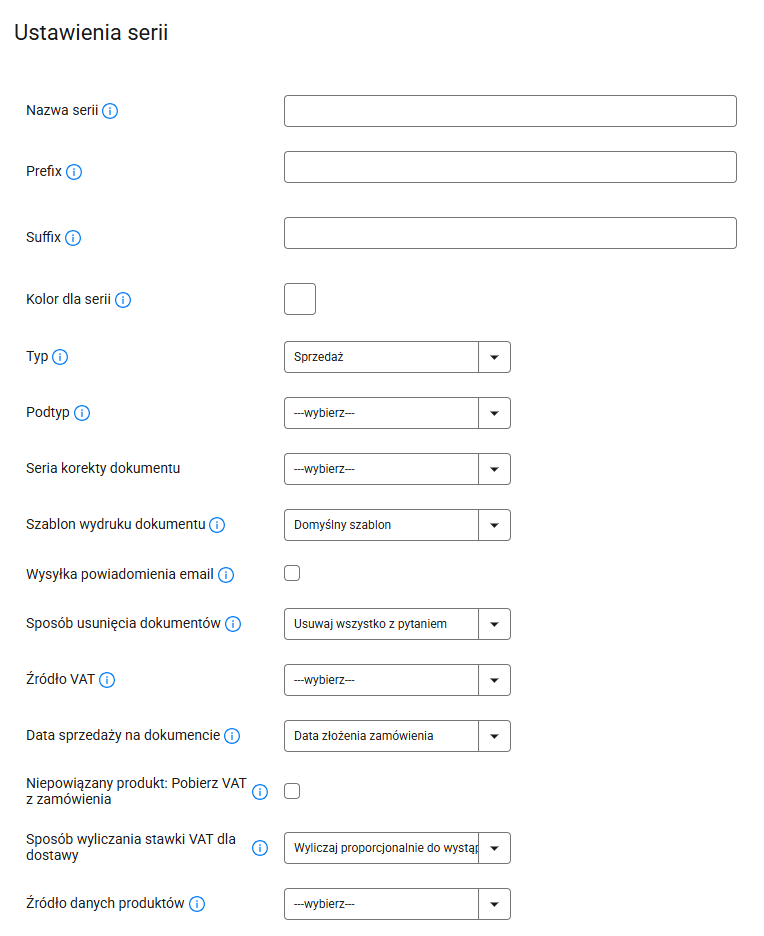3. Przechodząc do tworzenia lub edycji serii dokumentów, na ekranie zobaczysz formularz serii podzielony na dwie sekcje.