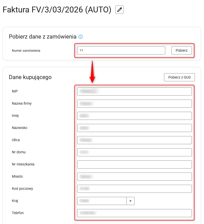 3. W sekcji Pobierz dane z zamówienia wpisz numer zamówienia, dla którego chcesz wystawić dokument, a następnie kliknij Pobierz. Dane z zamówienia zostaną automatycznie uzupełnione, a ewentualne brakujące informacje uzupełnisz ręcznie.