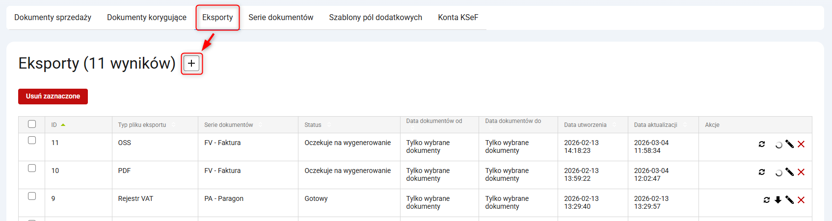 1. Przejdź do Dokumenty [Nowe] → Eksporty i kliknij przycisk z ikoną plusa.