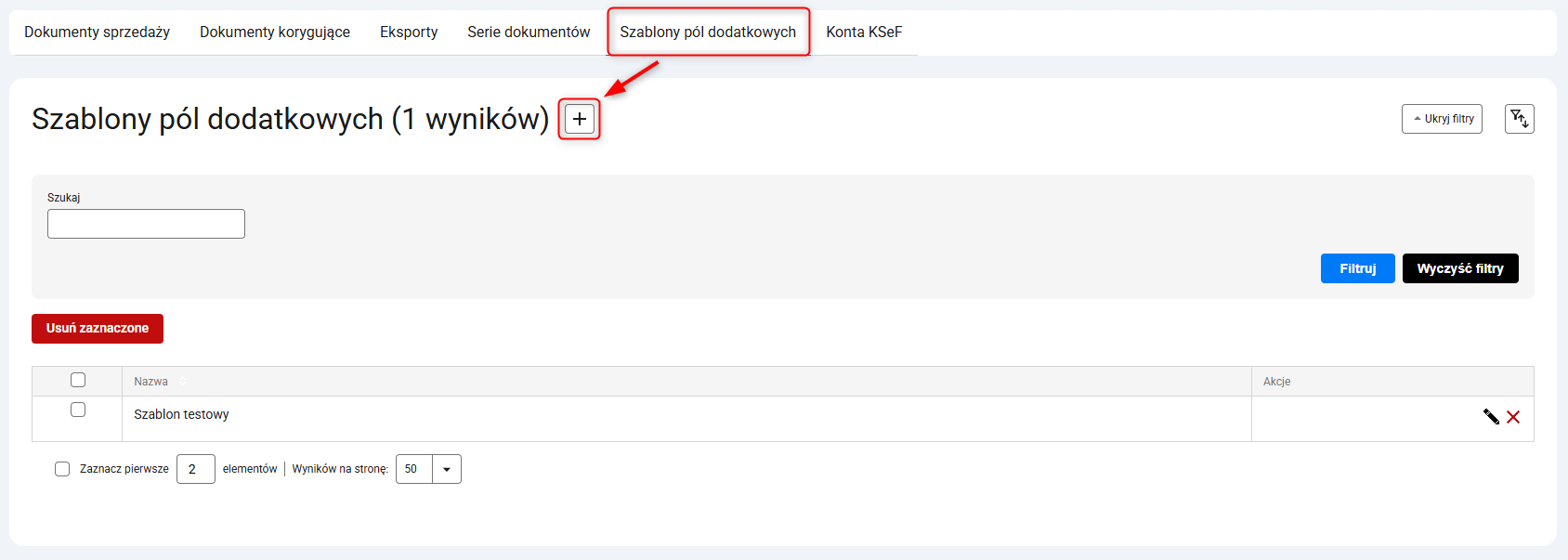 1. Przejdź do Dokumenty [Nowe] → Szablony pól dodatkowych i kliknij przycisk z ikoną plusa.