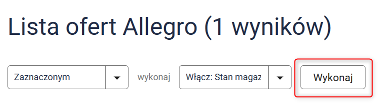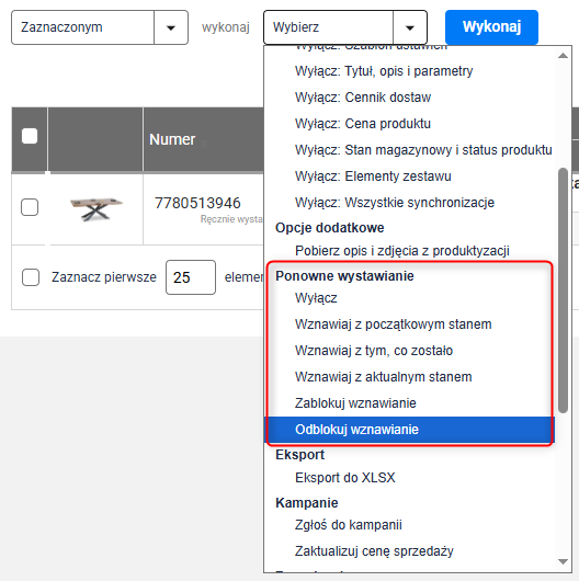 Uwaga: Synchronizacja stanów nie aktywuje zamkniętych ofert — aktualizuje jedynie stan magazynowy w ofertach, które są aktywne. Aby wznowić ofertę, na liście ofert należy uruchomić proces ponownego wystawiania, wybierając jedną z opcji wznawiania ofert (screen poniżej).