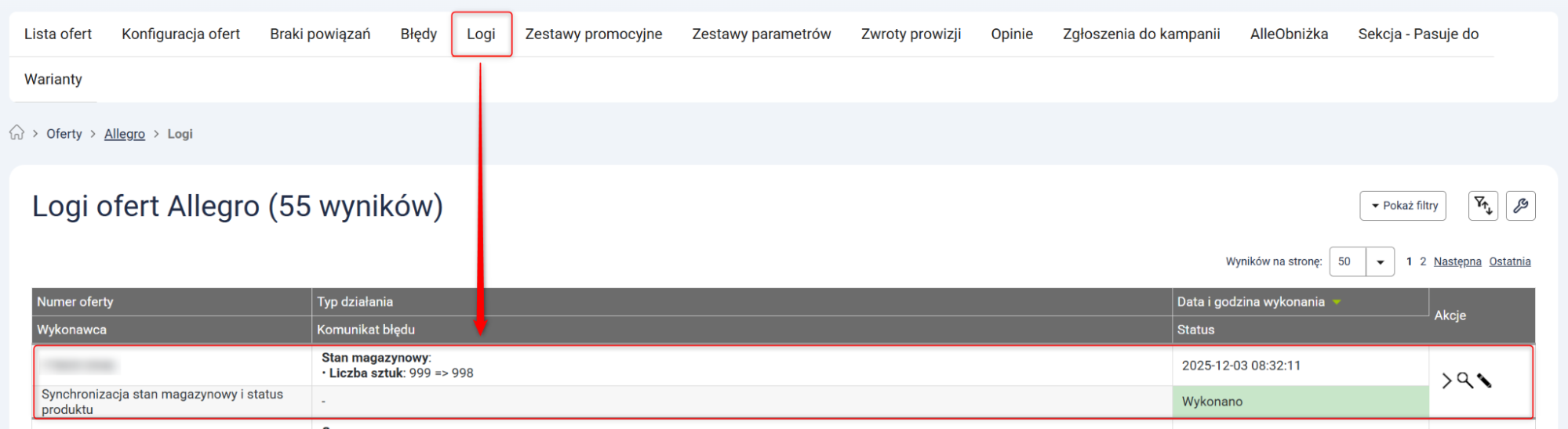 Wszelkie zmiany w stanach magazynowych wprowadzone w ramach synchronizacji znajdziesz w logach, w zakładce Logi.