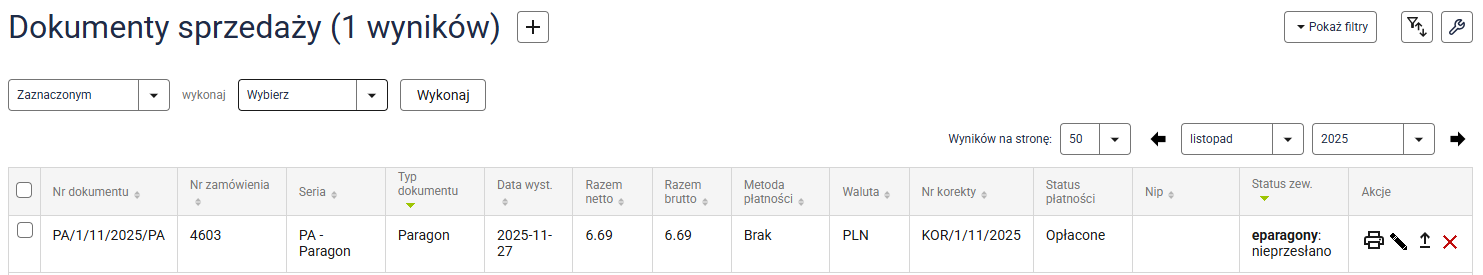 4. Paragon zostanie wystawiony. Wystawiony paragon znajdziesz w Dokumenty [Nowe] ⇨ Dokumenty sprzedażowe. Możesz go tam edytować, jeśli potrzebujesz jeszcze uzupełnić, dodać lub usunąć
