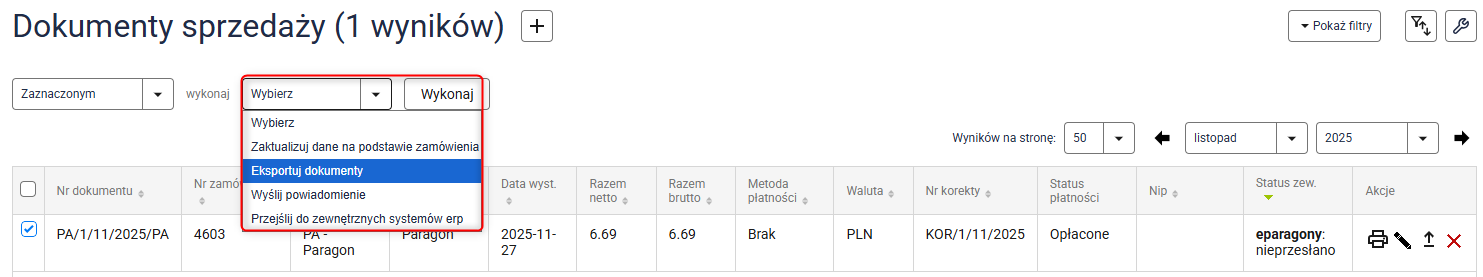 Listę paragonów znajdziesz w Dokumenty [Nowe] ⇨ Dokumenty sprzedaży. Zostanie wczytana lista wszystkich paragonów.