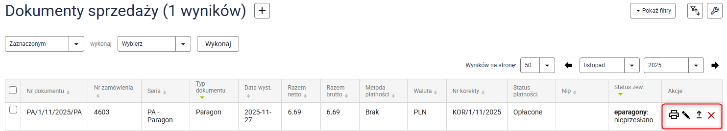 Przy każdym dokumencie znajdziesz przyciski, które pozwolą Ci przejść do edycji paragonów, wydrukować, usunąć wybrane paragony.