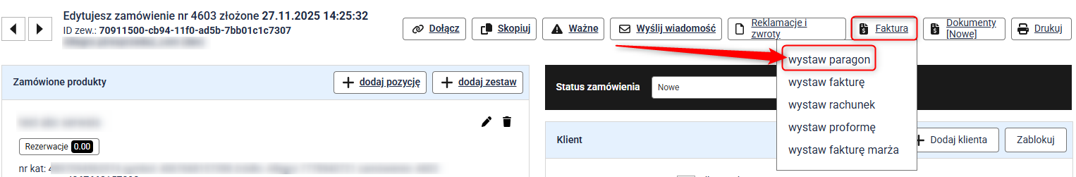 3. Najedź myszą na opcję Faktura ⇨ Wystaw paragon.