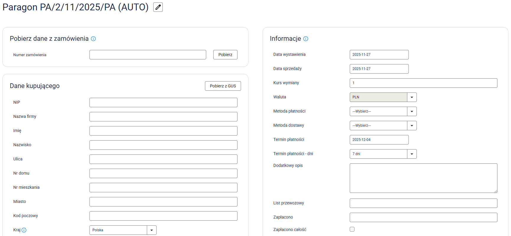 Paragon możesz wystawić z poziomu karty zamówienia, ręcznie lub automatycznie. Możesz dodać też paragon ręcznie bezpośrednio z karty Paragony.