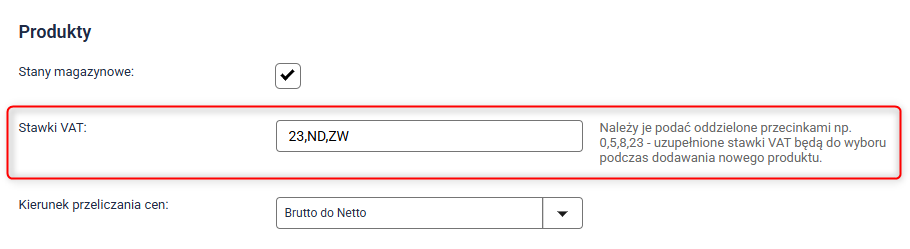 4. W sekcji Produkty odszukaj pole Stawki VAT.