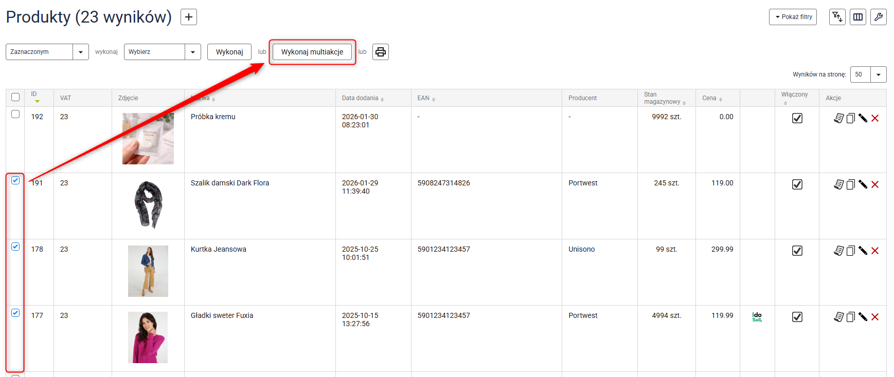 2. Zaznacz produkty, dla których chcesz zmienić stawkę VAT i kliknij przycisk Wykonaj multiakcje.