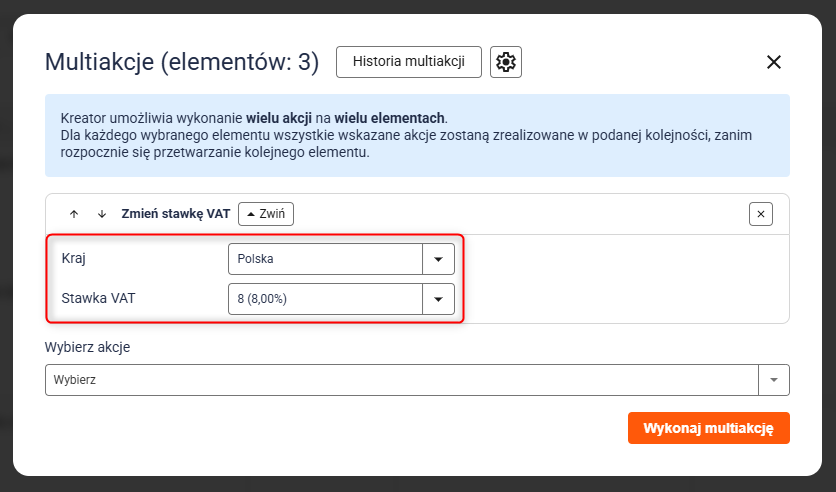 3. Z rozwijanej listy wybierz Zmień stawkę VAT. Następnie wybierz kraj oraz nową stawkę VAT i kliknij przycisk Wykonaj multiakcję.