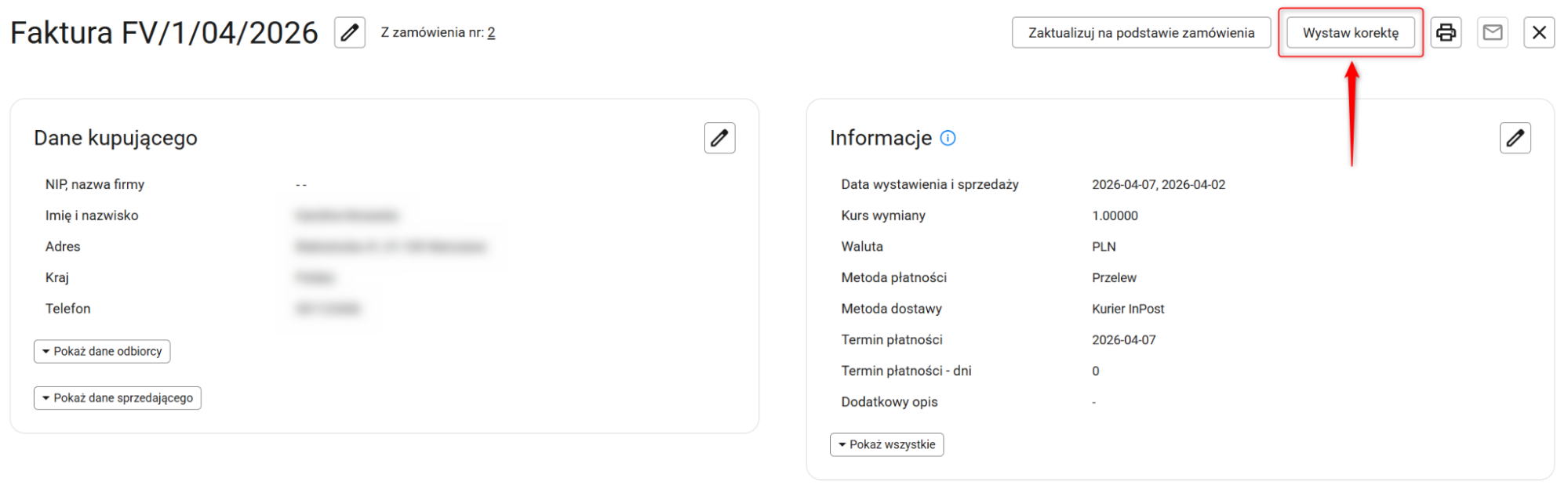 3. Na ekranie zobaczysz formularz tworzenia korekty — taki sam, jak w przypadku wystawiania korekty z modułu dokumentów.