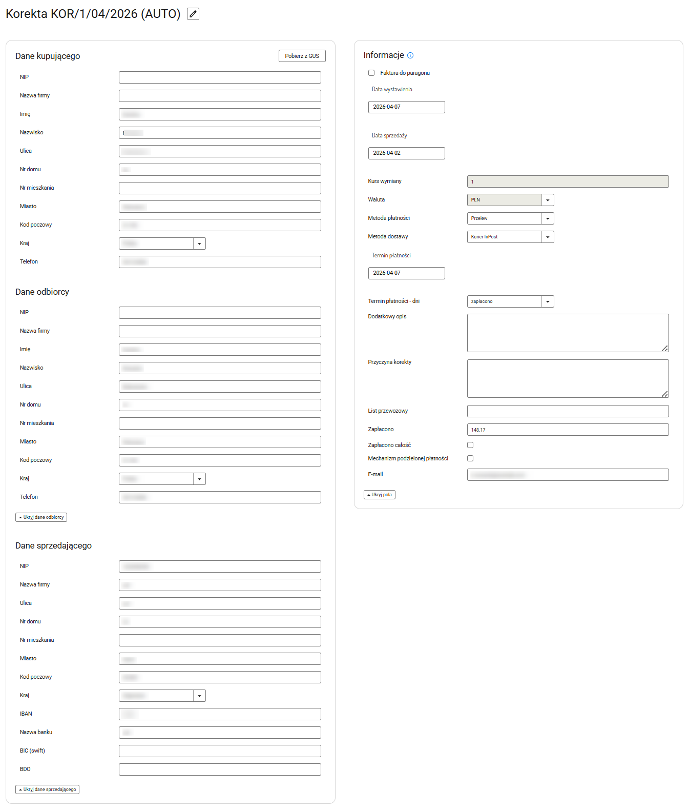 3. Na ekranie zobaczysz formularz tworzenia korekty.