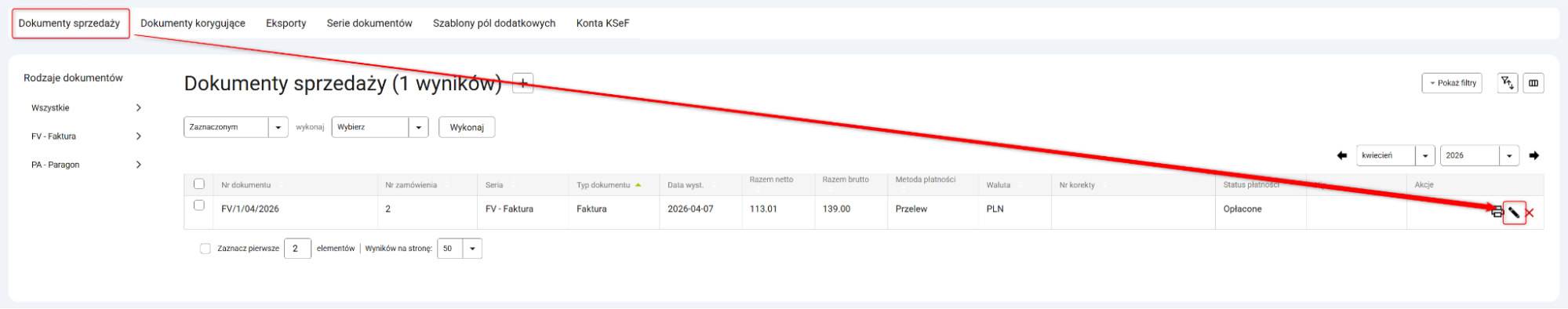 1. Przejdź do Dokumenty [Nowe] → Dokumenty sprzedaży i otwórz edycję wybranej faktury.