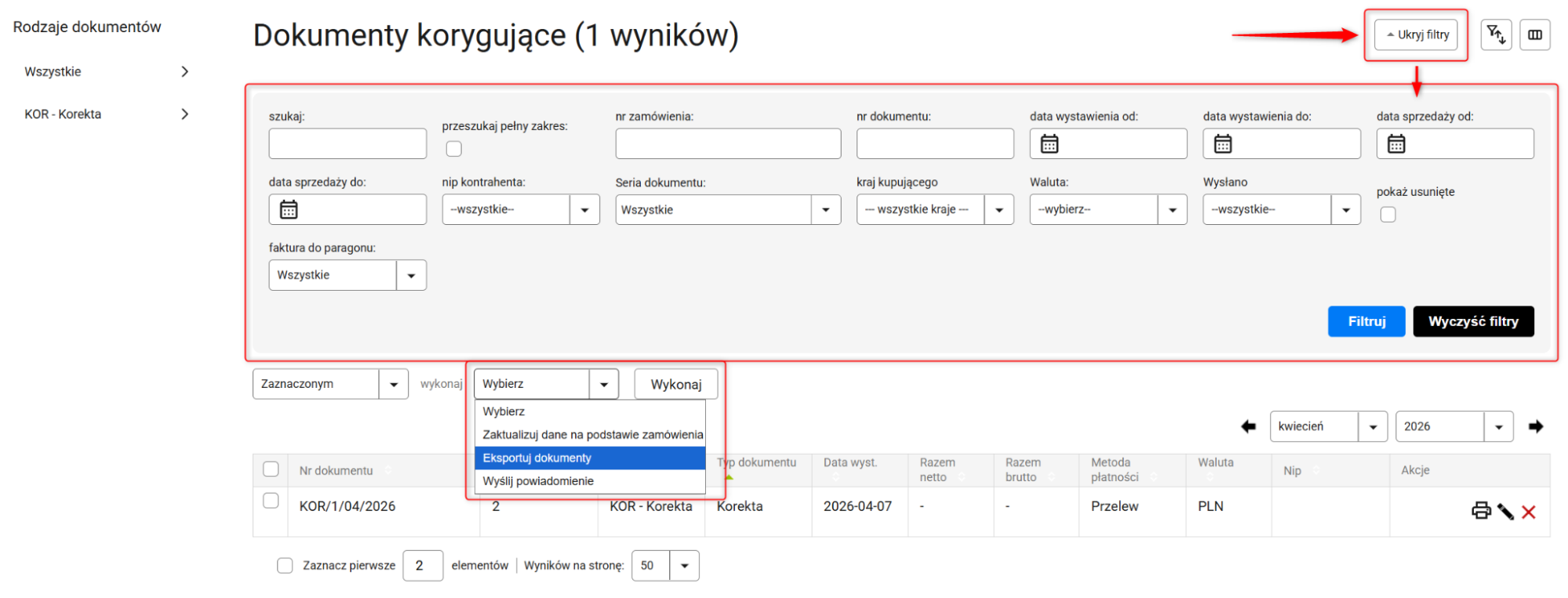 Dokumenty korygujące możesz filtrować i procesować według własnych potrzeb — np. zaktualizować, eksportować w wybranym formacie czy wysłać powiadomieniem do kupującego.