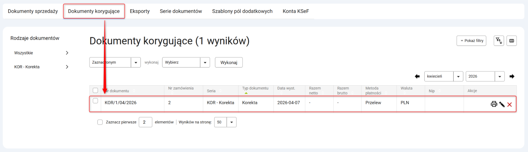 Utworzone korekty znajdziesz w Dokumenty [Nowe] → Dokumenty korygujące.