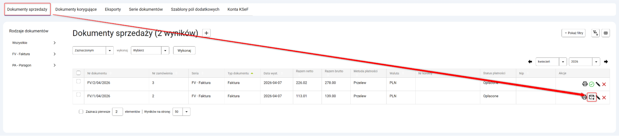 2. Przejdź do Dokumenty [Nowe] → Dokumenty sprzedaży i kliknij przycisk z ikoną koperty znajdujący się przy wybranej pozycji.