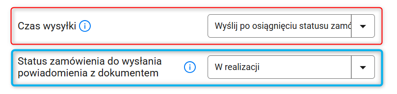 2. W sekcji Ustawienia serii ustaw czas wysyłki powiadomienia: od razu po wystawieniu dokumentu albo po osiągnięciu konkretnego statusu (wówczas pojawi się dodatkowa opcja wyboru konkretnego statusu, poniżej zaznaczona na niebiesko).