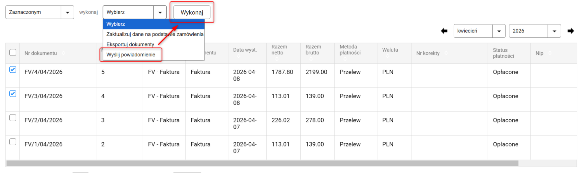 Odpowiednie powiadomienie z fakturą zostanie wysłane automatycznie.