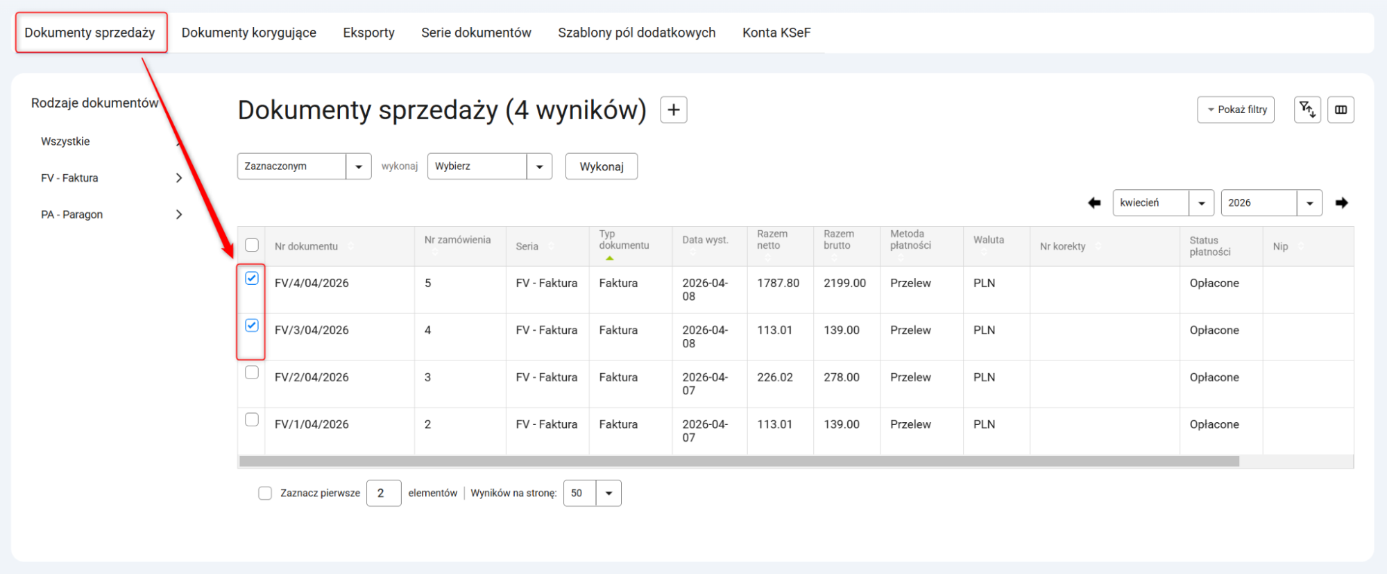 2. Przejdź do Dokumenty [Nowe] → Dokumenty sprzedaży i zaznacz wszystkie pozycje, które chcesz wysłać.