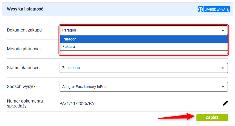 2. Na karcie zamówienia przejdź do sekcji WYSYŁKA I PŁATNOŚĆ i w rozwijanym menu wybierz odpowiedni dokument sprzedaży.