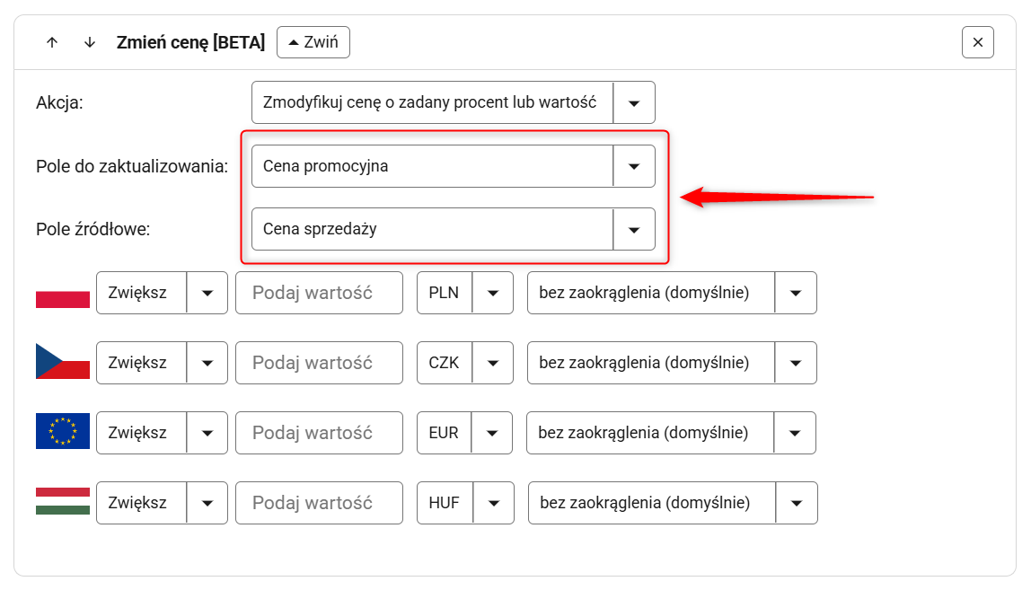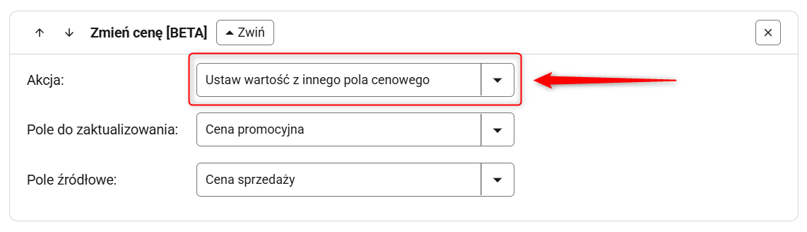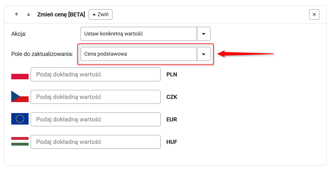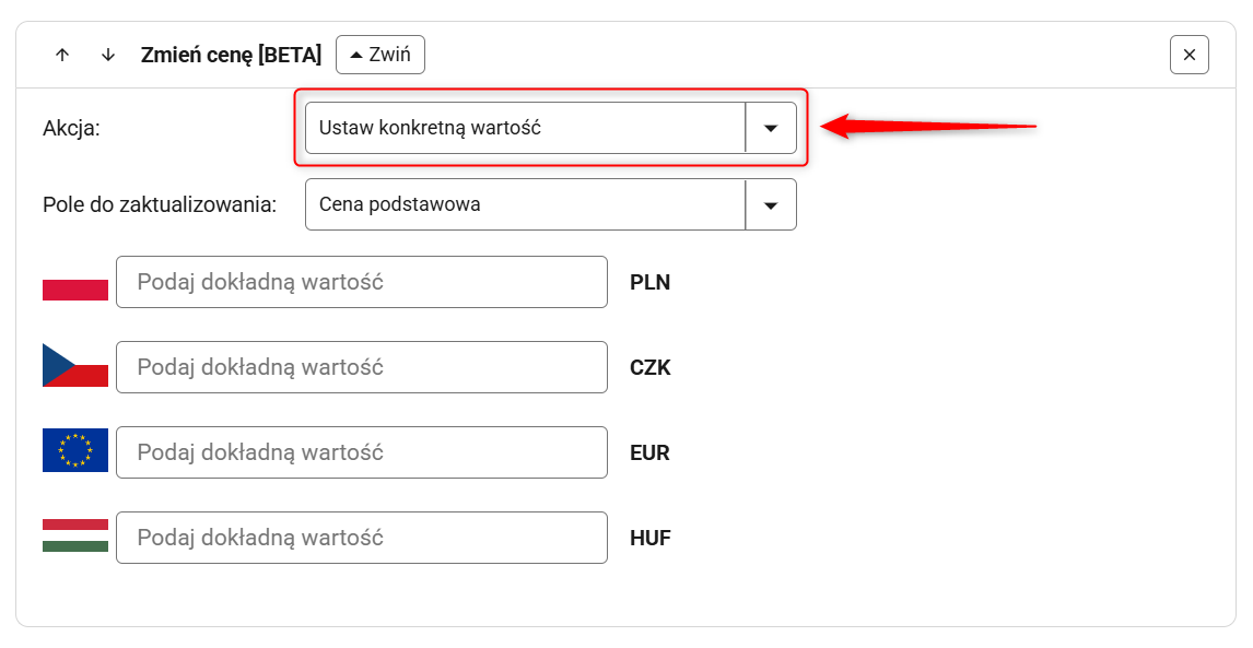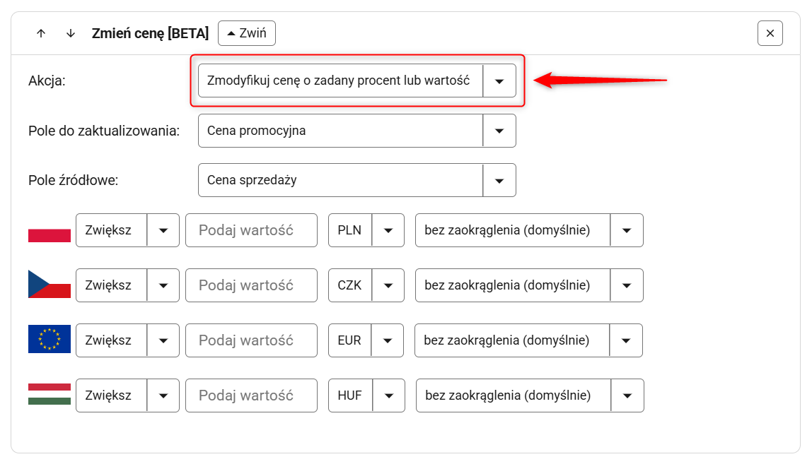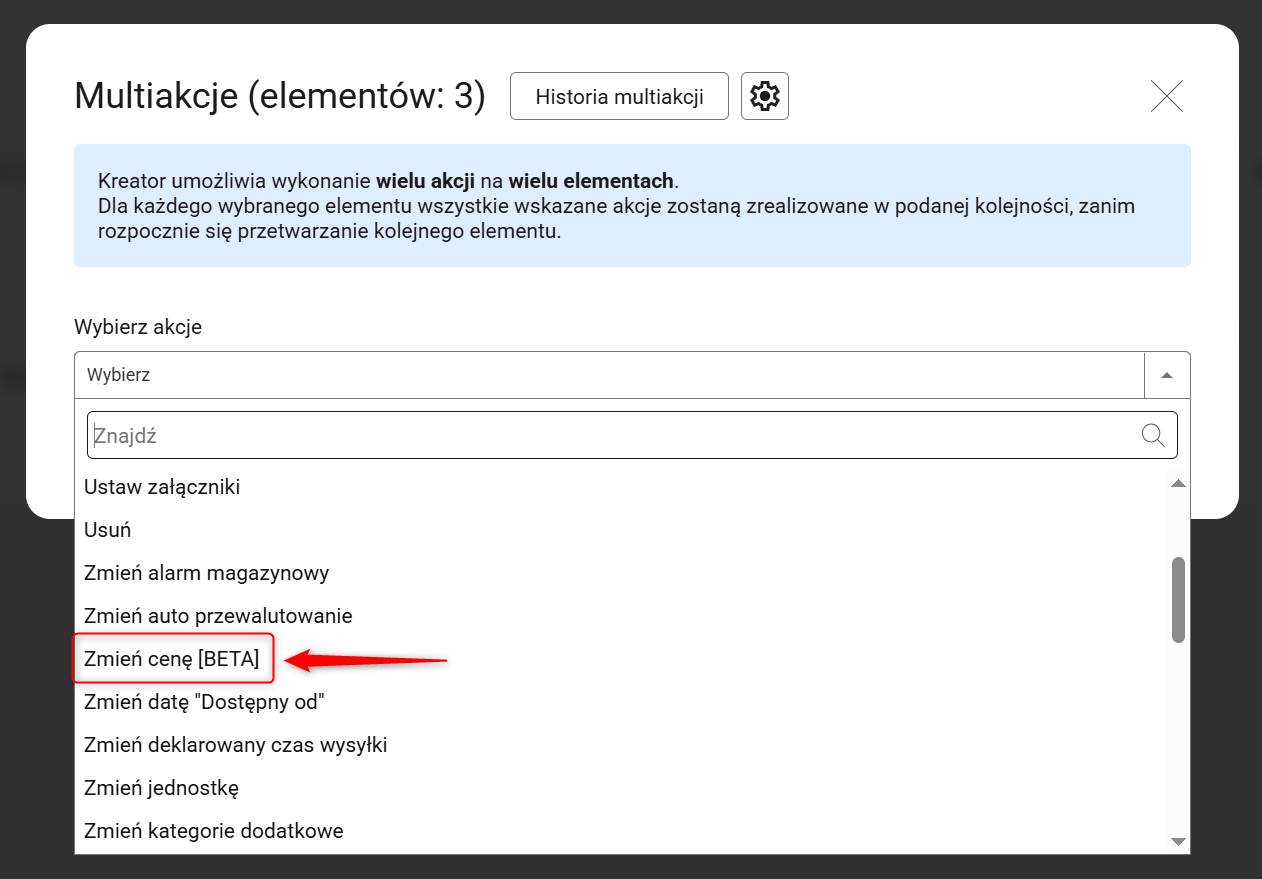 3. Na ekranie zobaczysz okno konfiguracji multiakcji. Z rozwijanej listy wybierz Zmień cenę [BETA].