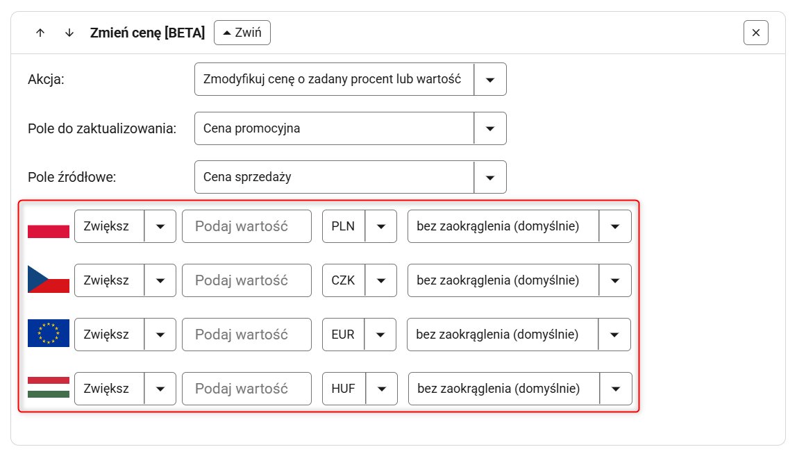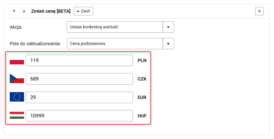 masowej zmianie cen produktów możesz precyzyjnie aktualizować ceny w wybranych walutach — np. zmienić wartość w CZK, pozostawiając bez zmian ceny w PLN czy EUR — bez ingerencji w pozostałe rynki.