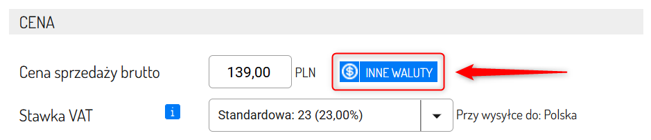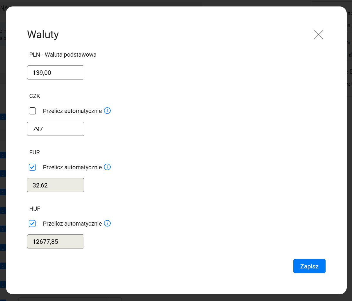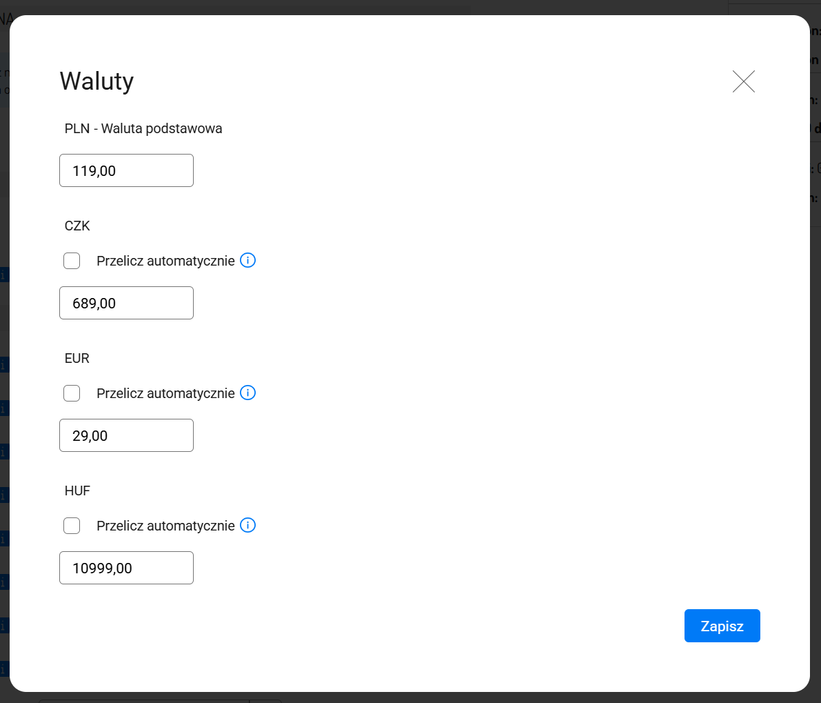 Wskazówka: Jeśli modyfikujesz waluty inne niż waluta podstawowa (np. edytujesz CZK), wybrane waluty przestaną być przeliczane automatycznie na karcie produktu w sekcji Cena (patrz: screeny poniżej).