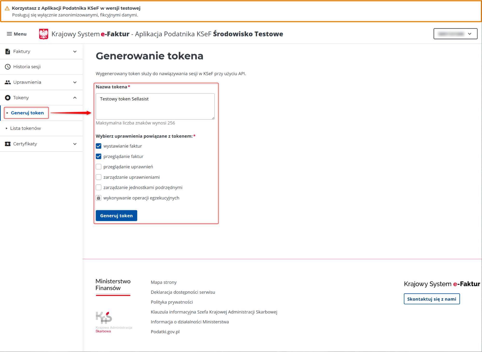 Po wypełnieniu formularza kliknij przycisk Generuj token.