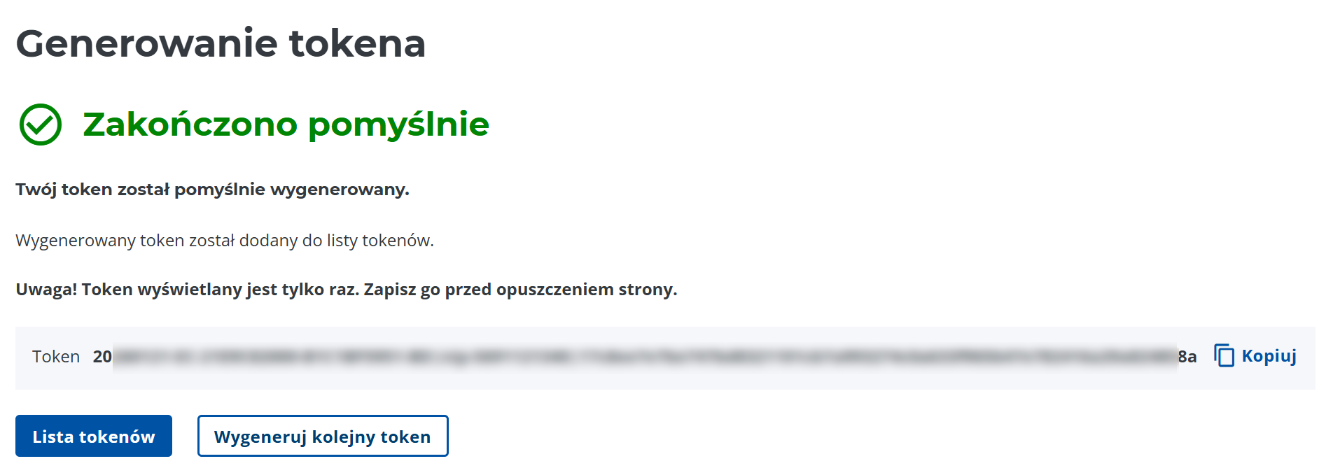 Na ekranie zobaczysz wygenerowany token.