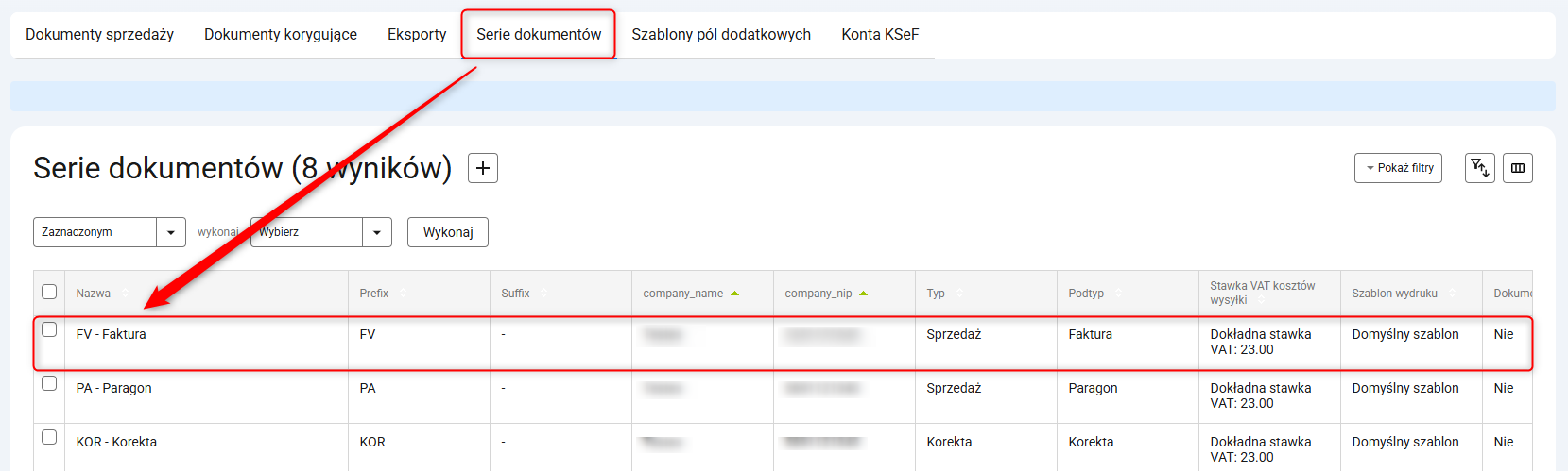 Informację na temat aktywnego konta KSeF dla danej serii dokumentu znajdziesz, przechodząc do Dokumenty [Nowe] → Serie dokumentów → Wybrana seria.